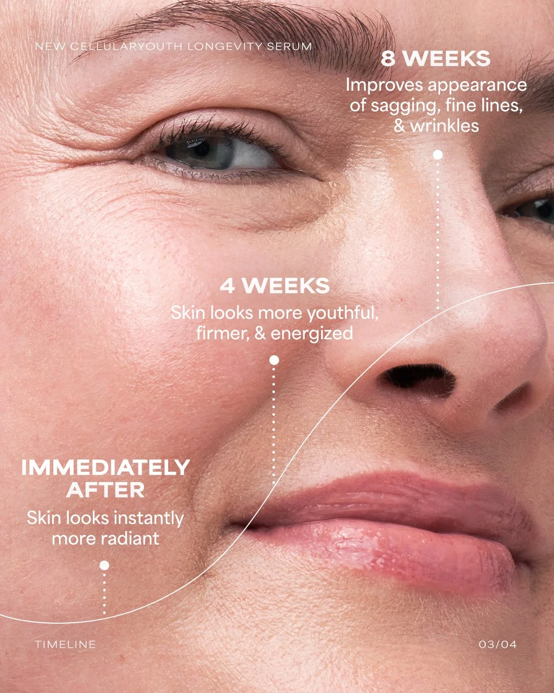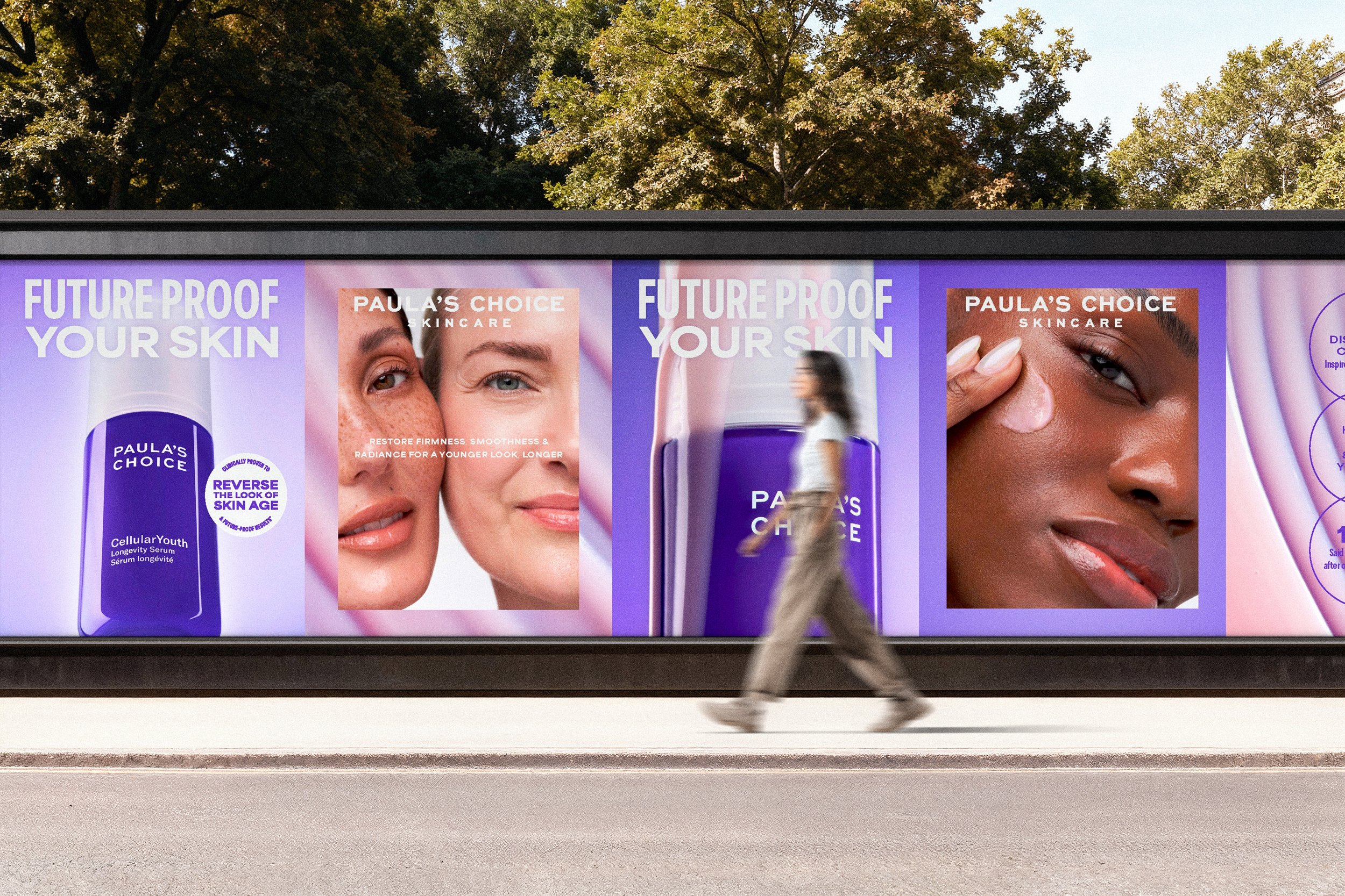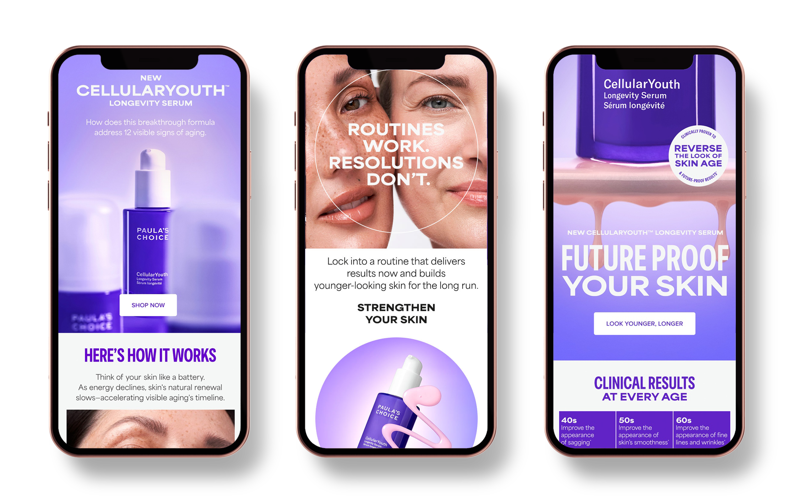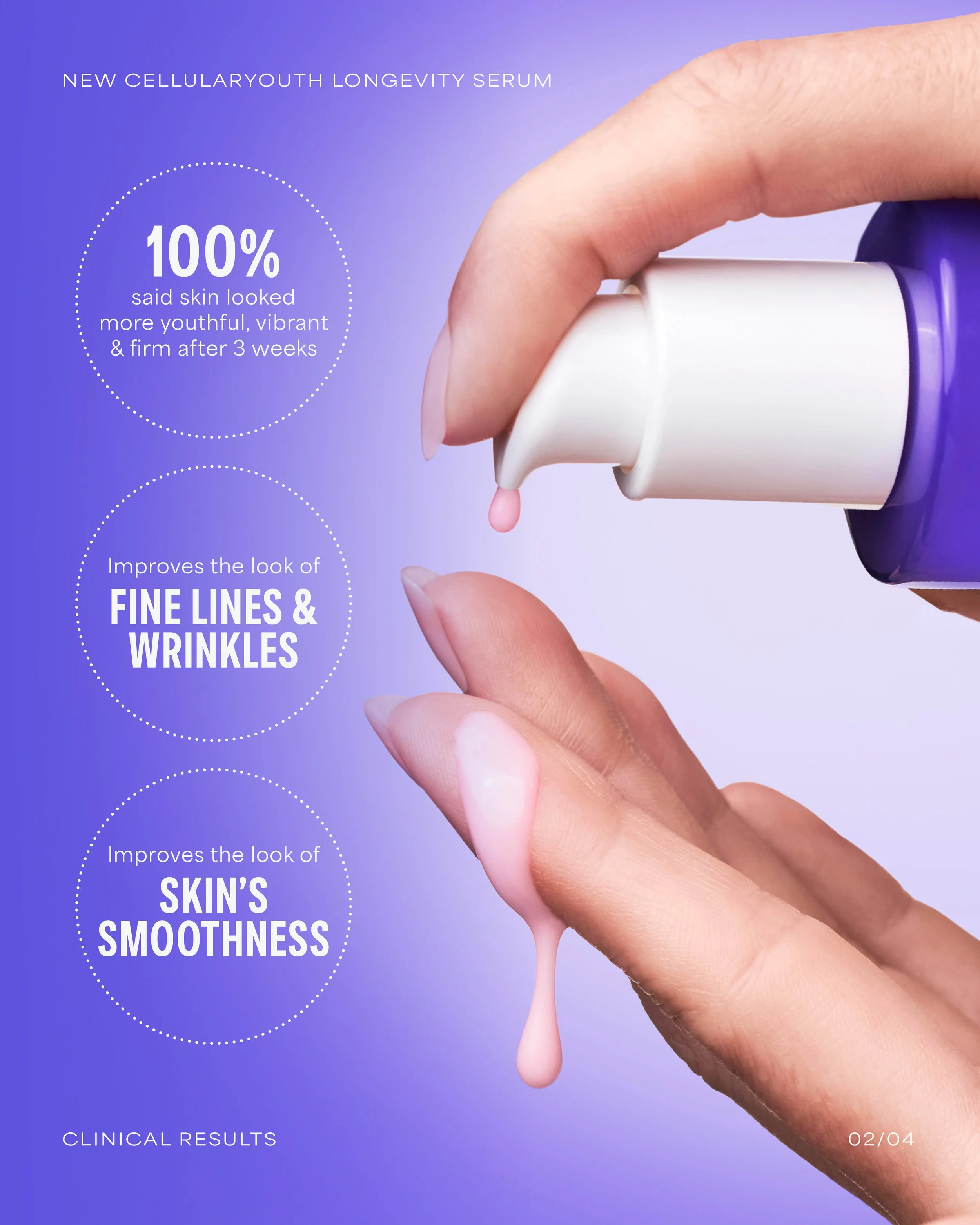 The creative concept for the CellularYouth Longevity Serum launch centers on the reactivation of cellular energy. Drawing from NAD+ science and longevity research, the visual system expresses transformation—cells shifting from sluggish and fragmented to energized and aligned. Pulsing light, radiating glow, and fluid motion signal age disruption and renewed vitality, reinforcing the serum’s promise to visibly reverse the look of skin age. A restrained, futuristic palette of moonlit neutrals and electric purple establishes a biotech-forward aesthetic, while holographic accents and luminous textures add depth without excess. Restrained, modern typography and controlled compositions ground the campaign in scientific credibility, creating a bold, future-facing launch that balances clinical authority with elevated desire.